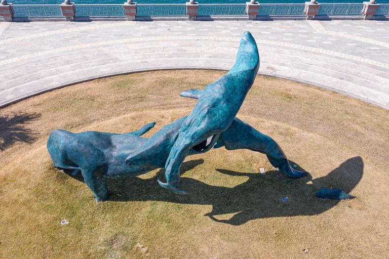 ▲「海洋之舞」作品由三隻鯨魚組成「人」字…