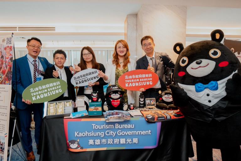 ▲高雄觀光隊在高雄熊主題櫥窗前合影。(圖/…