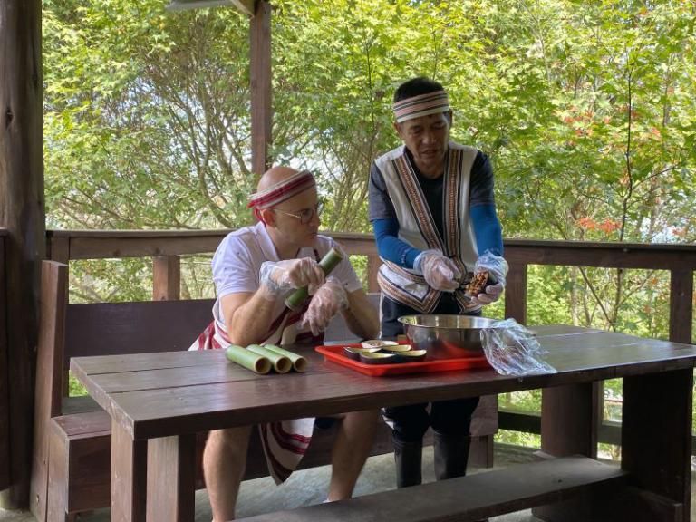 ▲吳鳳體驗族人的傳統製作竹筒飯。(圖/新竹…