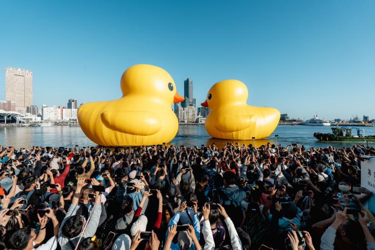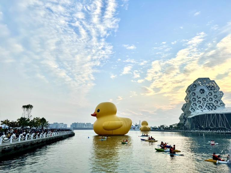 ▲黃色小鴨與獨木舟民眾共遊愛河灣。(圖/觀…