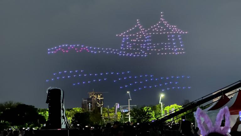 ▲無人機群飛展演在夜空中排出湖心亭。(觀…