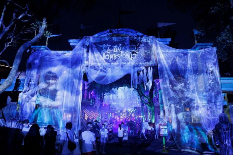 ▲全台最大萬聖慶典六福村墓碑鎮已登場。(…