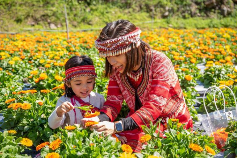 ▲尖石鄉那羅部落優美恬適,田間種植金盞花…