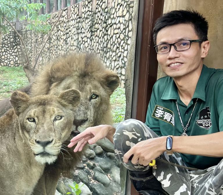 ▲李姓保育員與非洲獅「大姊」及「二哥」合…