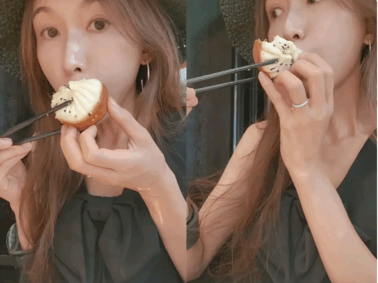 林志玲吃一顆生煎包分了十幾口。(圖/翻…