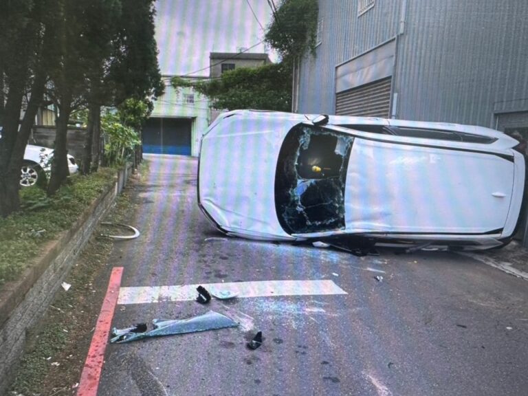 中壢休旅車自撞翻覆車內1家4人受傷。翻攝…