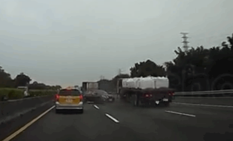 國道自小客車遭撞擊打轉再撞護欄。翻攝畫…