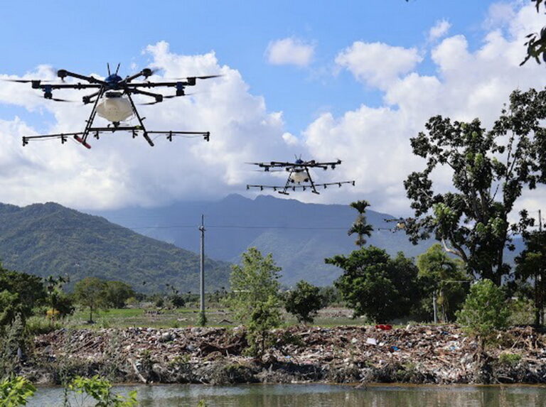 ▲民間無人機結合化學兵調製消毒藥劑進行大…
