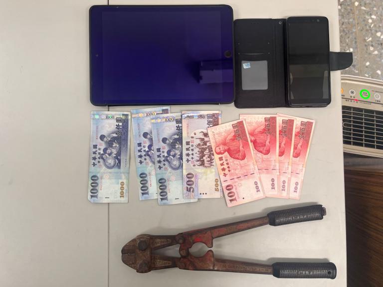 ▲犯嫌所使用破壞鐵鍊之鐵剪、竊取得手現金…