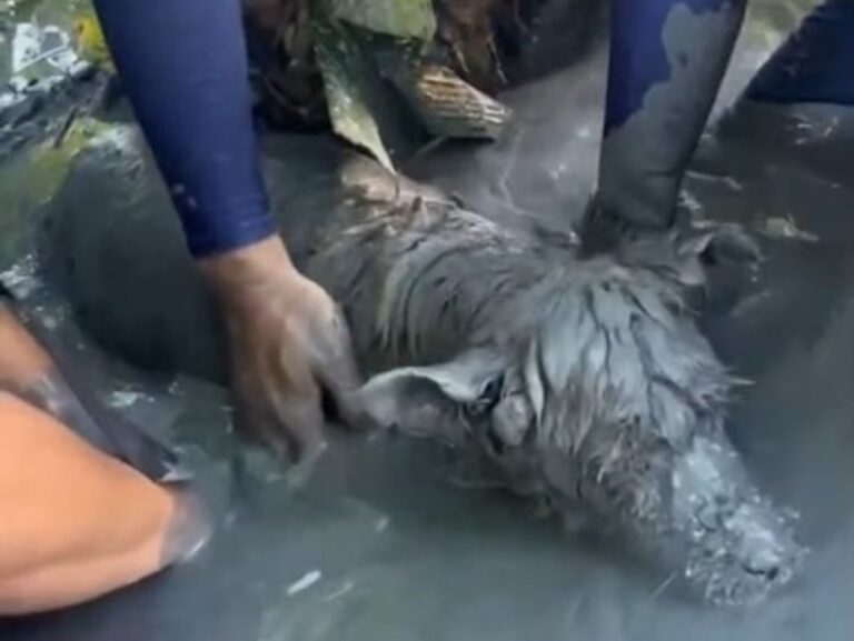 ▲特搜隊徒手救出受困3天身陷泥濘的狗狗。…