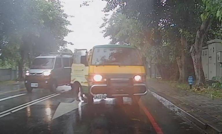 ▲傾盆大雨娃娃車拋錨,中興分局員警冒雨救…