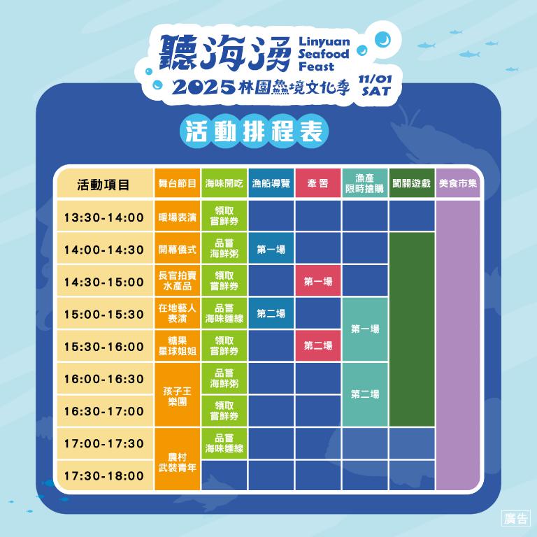 活動精彩豐富,當天由林園舞蹈協會、林園舞蹈團協會還有Fuxion街舞團帶來青春洋溢的開場演出,現場更邀請在地藝人小尾魚、楊志源及陳姚如,以及知名樂團「孩子王樂團」及「農村武裝青年樂團」等輪番登台。此外還有「漁味限時搶購」活動,漁民現撈漁產直送會場,新鮮美味、價格實惠,機會難得、絕對不能錯過!「闖關遊戲區」則設計多項以魚類與漁具為主題的教育遊戲,讓孩子在遊玩中學習食魚文化,完成闖關即可兌換消費券。除了舞台節目,還有「養殖文化館」更展示龍膽石斑、虱目魚等魚苗,讓民眾近距離觀察魚類成長過程,了解漁民結合科學與經驗的養殖智慧。現場並設有「三角漁網撈魚體驗」及「翻牌遊戲」手作體驗,讓親子共同學習傳統捕魚與魚體構造知識,在寓教於樂的互動中認識海洋文化。另外同日上午11時至下午3時結合林園養殖協會辦理「2025林園大尾魚仔!海味踩街祭」活動,以巨型石斑魚公仔為祭典核心,邀請500名在地小朋友身穿浴衣,一同在林園進行踩街遊行,守護林園海洋文化,並串聯「聽海湧.2025林園鱻境文化季」活動,讓熱鬧氣氛延續一整天。
