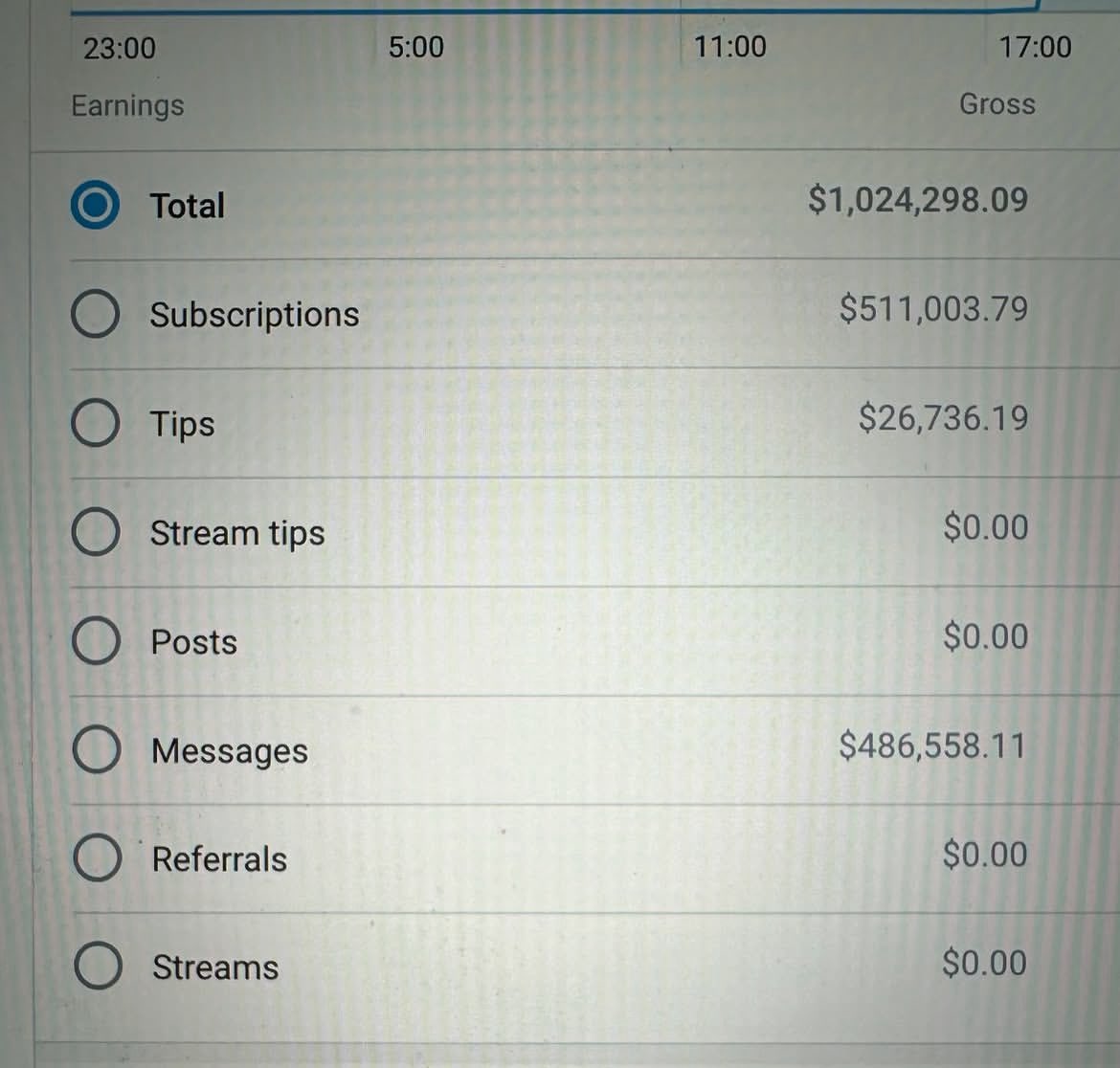 影片中附上一張螢幕截圖,顯示她在該平台透過訂閱、抖內與訊息等方式獲得了1024298.09美元。她在貼文中寫道:「三個小時賺這樣,不錯吧?我們直接打破OnlyFans的紀錄!」