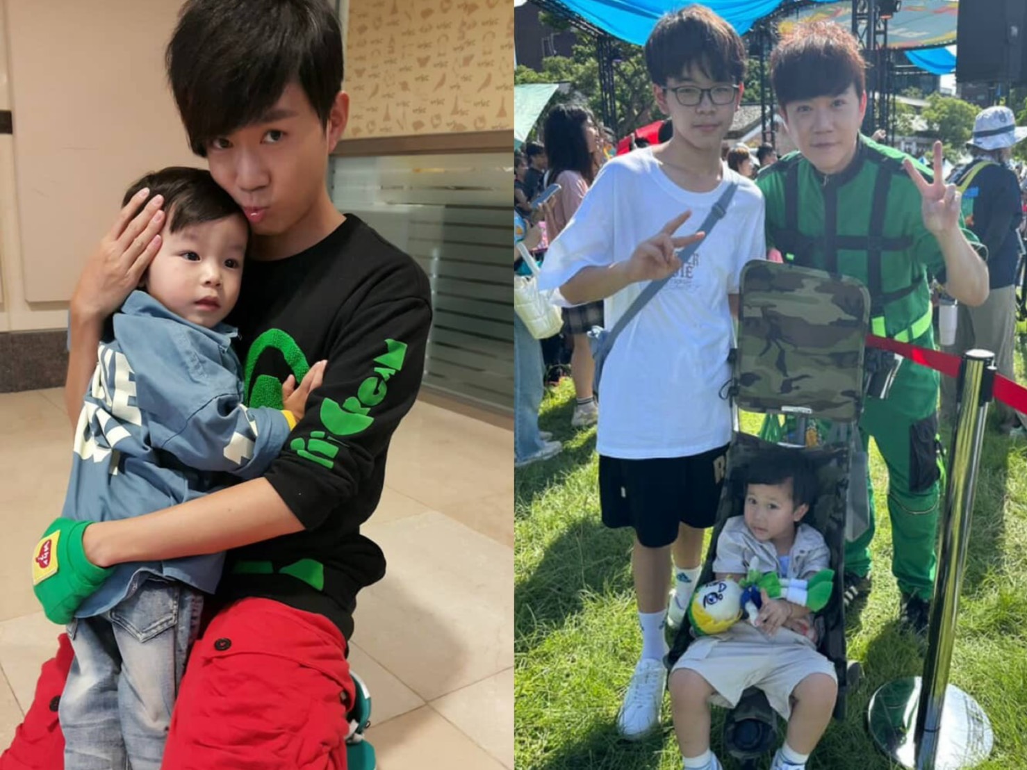 李岳多年前和粉絲第一胎兒子合影(圖左),多年後粉絲已成為二寶媽,帶著哥哥和弟弟與李岳合影(圖右)。(圖/李岳提供)