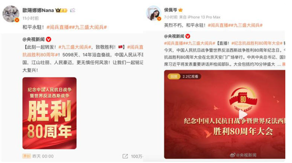 歐陽娜娜、侯佩岑也轉發中共93閱兵貼文。(圖/翻攝微博)