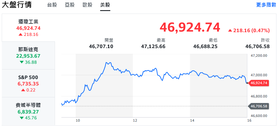 市場正評估第三季財報表現與聯準會降息政策,投資人維持觀望,美股週二(21日)表現分歧,道瓊終場上漲218.16點、收46,924.74點;標普500幾乎收平盤6,735.35點;那斯達克回落36.88點、收22,953.67點;費半跌幅0.66%、收6,839.27點。