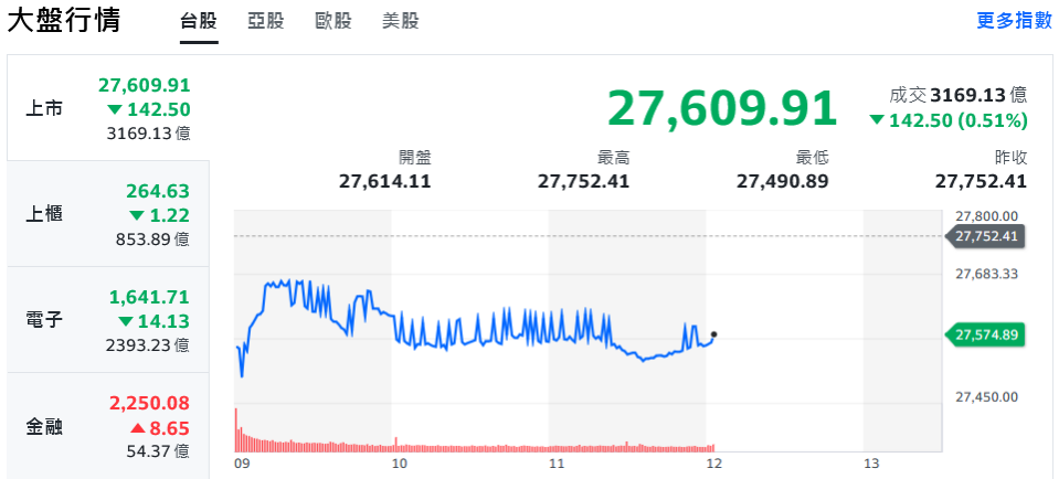 台積電表現熄火,台股週三(22日)震盪走低,加權指數盤中下挫逾200點,最低來到27,490點,電子股普遍熄火,資金輪轉至BBU、塑化、航運等非電族群蹲點,預估成交量約5000億元。