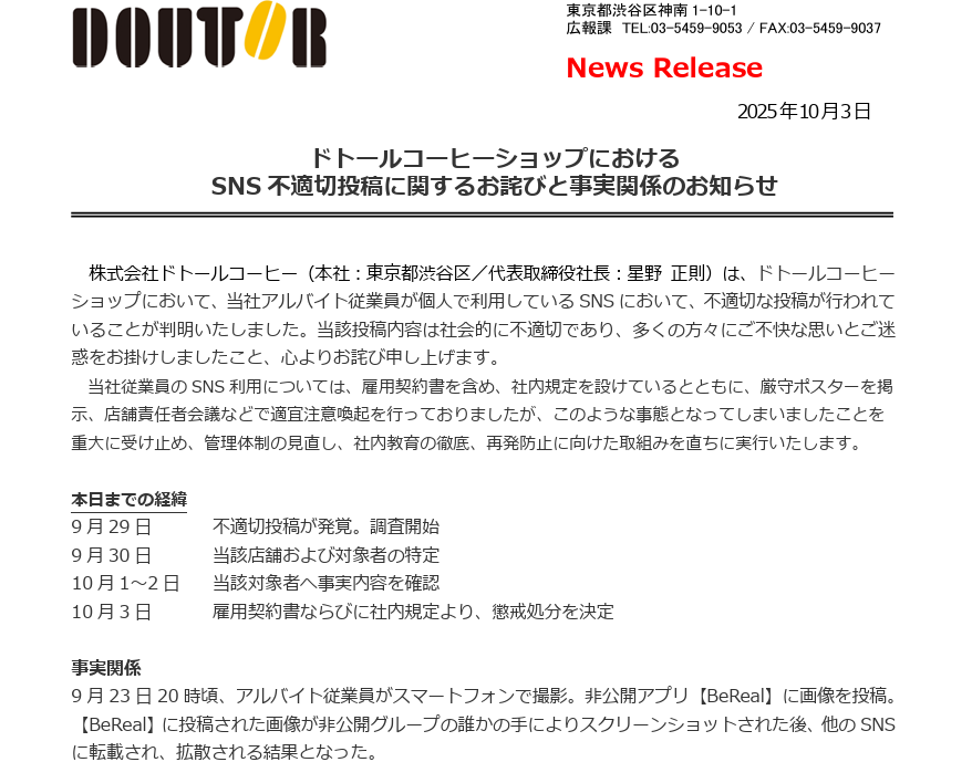 「DOUTOR」發表公告指出,旗下一家門店的兼職員工在其個人社交帳戶上發佈了不當內容,給廣大顧客帶來的不適和不便,深表歉意。關於員工使用社交媒體,我們已制定了包括雇傭合約在內的內部規定,並張貼了嚴格遵守的海報,並在門店責任人會議等方面進行了相應的警告。然而,我們高度重視此次事件,將立即重新審視管理體系,徹底進行公司內部教育,並採取措施防止此類事件再次發生。