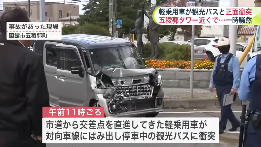 根據UHB北海道文化放送報導,事故發生在20日上午11點左右,地點位於函館市五稜郭町、市道與道道交會的十字路口。當時,一輛沿市道直行的K-Car突然駛入對向車道,與停著的觀光巴士正面相撞。