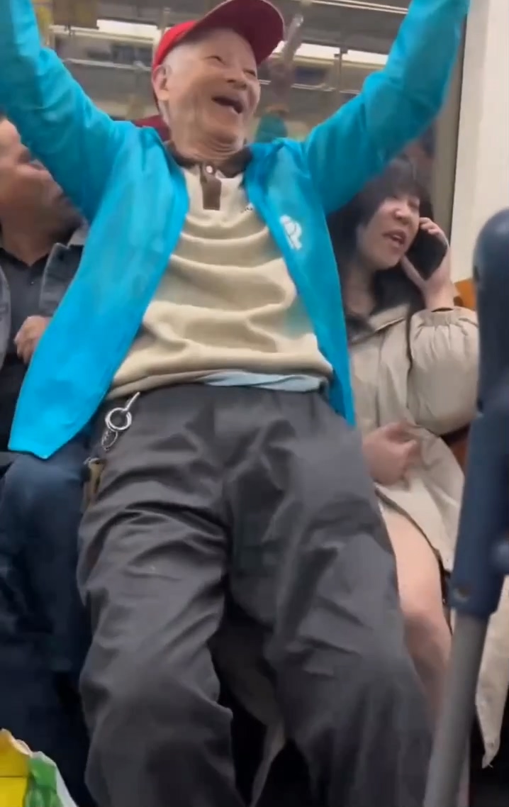 影片中可看見,穿藍衣的老人硬是要坐在一名年輕女子腿上,即便旁邊的另一名男乘客看不過去,一邊痛駡並幫忙推開老人,但老人抓住把手、用腳抵著車廂內的欄杆,一副絕不讓步的姿態,還露出得意的笑臉。