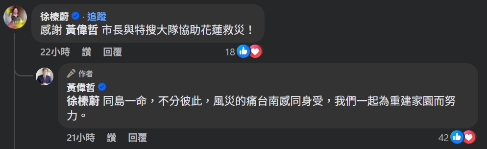 花蓮縣政府在黃偉哲臉書留言感謝,「感謝黃市長與特搜大隊攜手花蓮,陪伴鄉親度過難關!」縣長徐榛蔚也親自致謝。對此,黃偉哲回應,「同島一命、不分彼此,台南經歷過地震和颱風,更懂得災難的痛,我們一定要陪花蓮一起走過。」