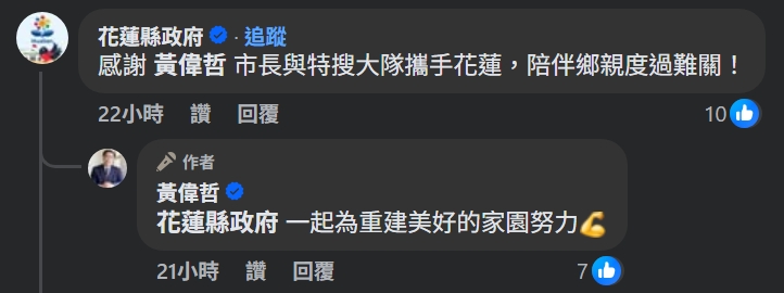 花蓮縣政府在黃偉哲臉書留言感謝,「感謝黃市長與特搜大隊攜手花蓮,陪伴鄉親度過難關!」縣長徐榛蔚也親自致謝。對此,黃偉哲回應,「同島一命、不分彼此,台南經歷過地震和颱風,更懂得災難的痛,我們一定要陪花蓮一起走過。」