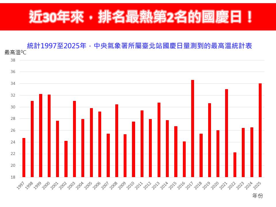 【Lai傳媒、記者爆料網/林千允/綜合報導】今年的國慶日熱到讓人懷疑季節!根據中央氣象署觀測,10月10日受偏東至東南風影響,加上水氣減少,全台陽光強烈、熱氣逼人。臺北站當日測得高溫達34.0°C,創下近30年來國慶日第2高溫紀錄,僅次於2017年同日的34.6°C。
