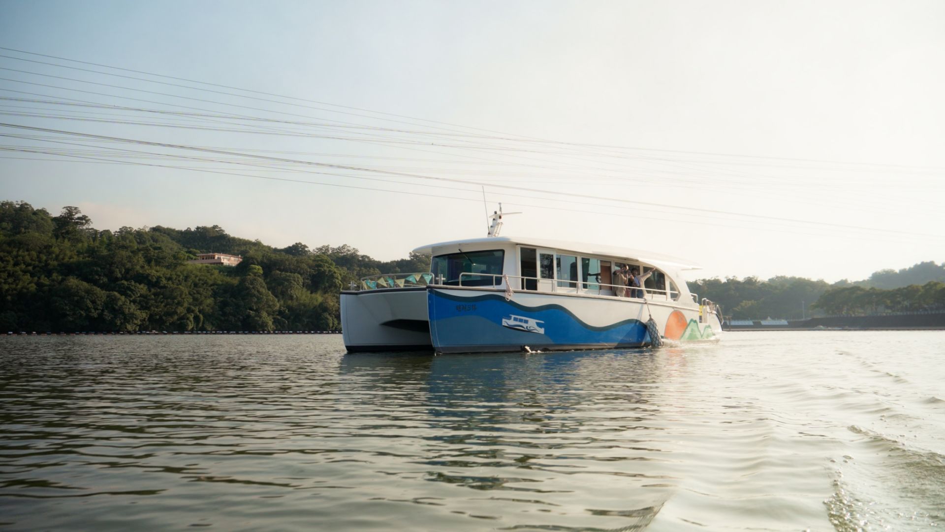 太陽能遊艇在明德水庫悠然航行,旅客可於湖面上欣賞山光水色,體驗全新「水上漫遊」遊湖行程。(官方提供)