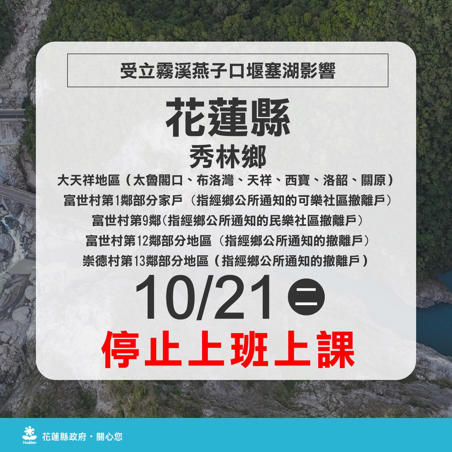 花蓮縣政府指出,本縣秀林鄉大天祥地區(太魯閣口、布洛灣、天祥、西寶、洛韶、關原)、富世村第1鄰部分家戶 (指經鄉公所通知的可樂社區撤離戶)、富世村第9鄰(指經鄉公所通知的民樂社區撤離戶)、富世村第12鄰部分地區 (指經鄉公所通知的撤離戶)、崇德村第13鄰部分地區(指經鄉公所通知的撤離戶),明(21)日停止上班、停止上課。