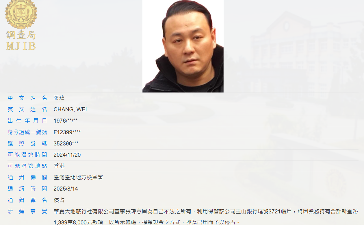 根據調查局網站公告,張瑋身為華夏大地旅行社董事,卻利用保管公司帳戶的權力,將裡面存有的1389萬8000元款項,以轉帳、提領現金方式挪為己用,拿去償還個人信用卡、車貸,遭判刑後疑似在去年11月20日就棄保潛逃出境到香港,因此在本月14日正式發布通緝。