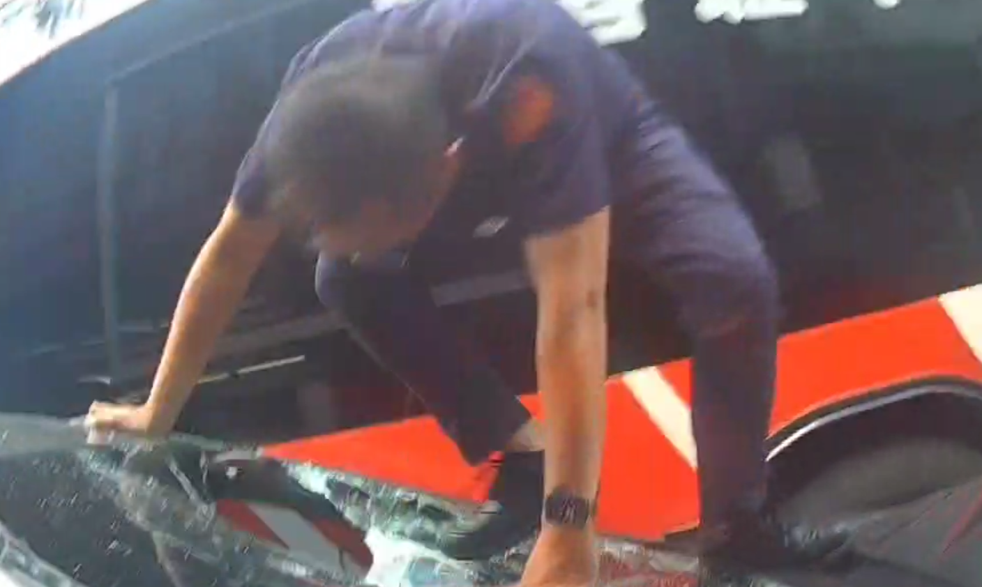 員警跳上嫌犯車子踹車,並用安全帽敲打車窗喝令嫌犯下車。翻攝畫面