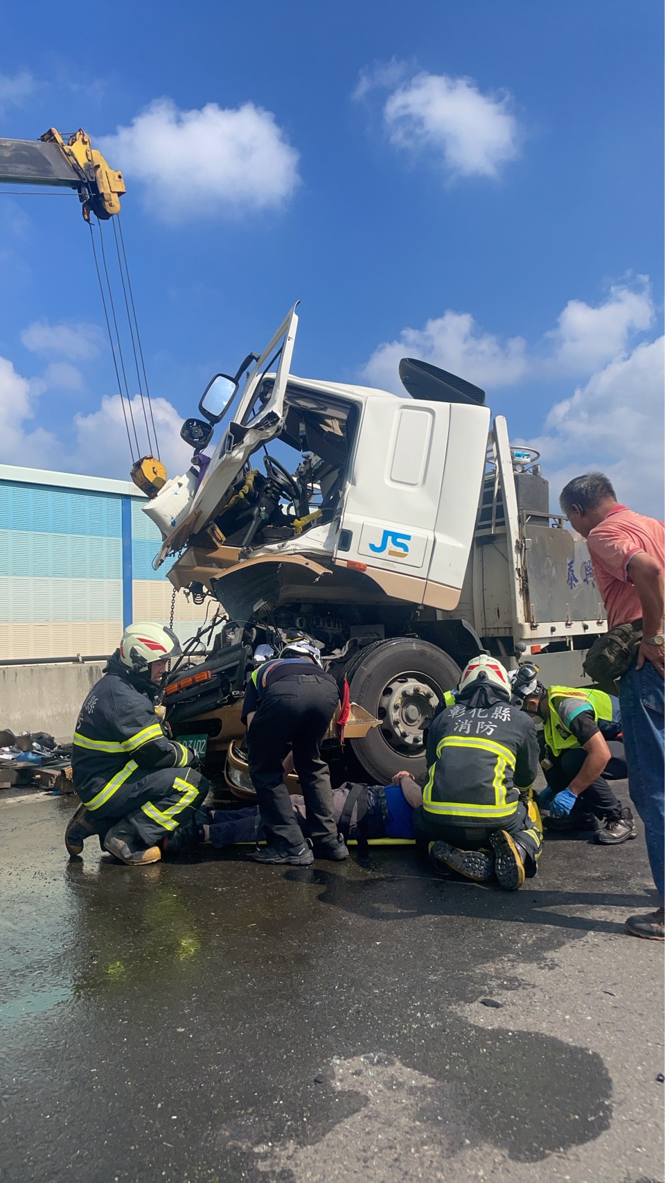 台61線大貨車追撞曳引車駕駛受困車內,消防隊員前往救援。翻攝畫面