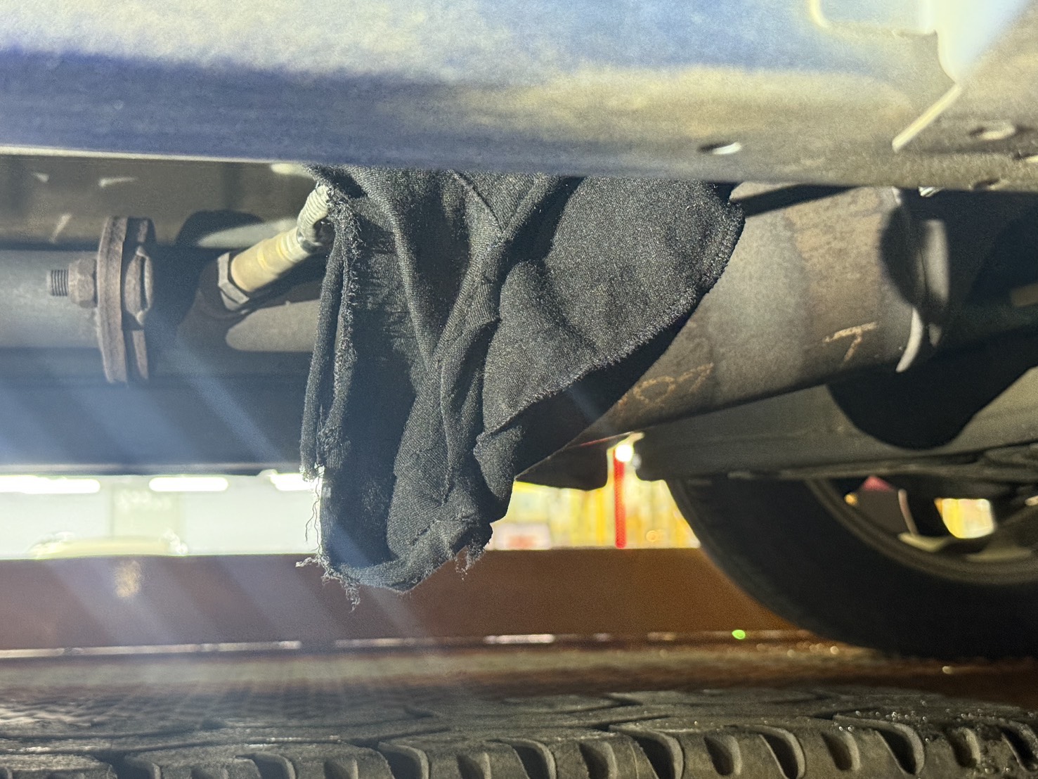 吳女衣物夾在車子底盤。翻攝畫面