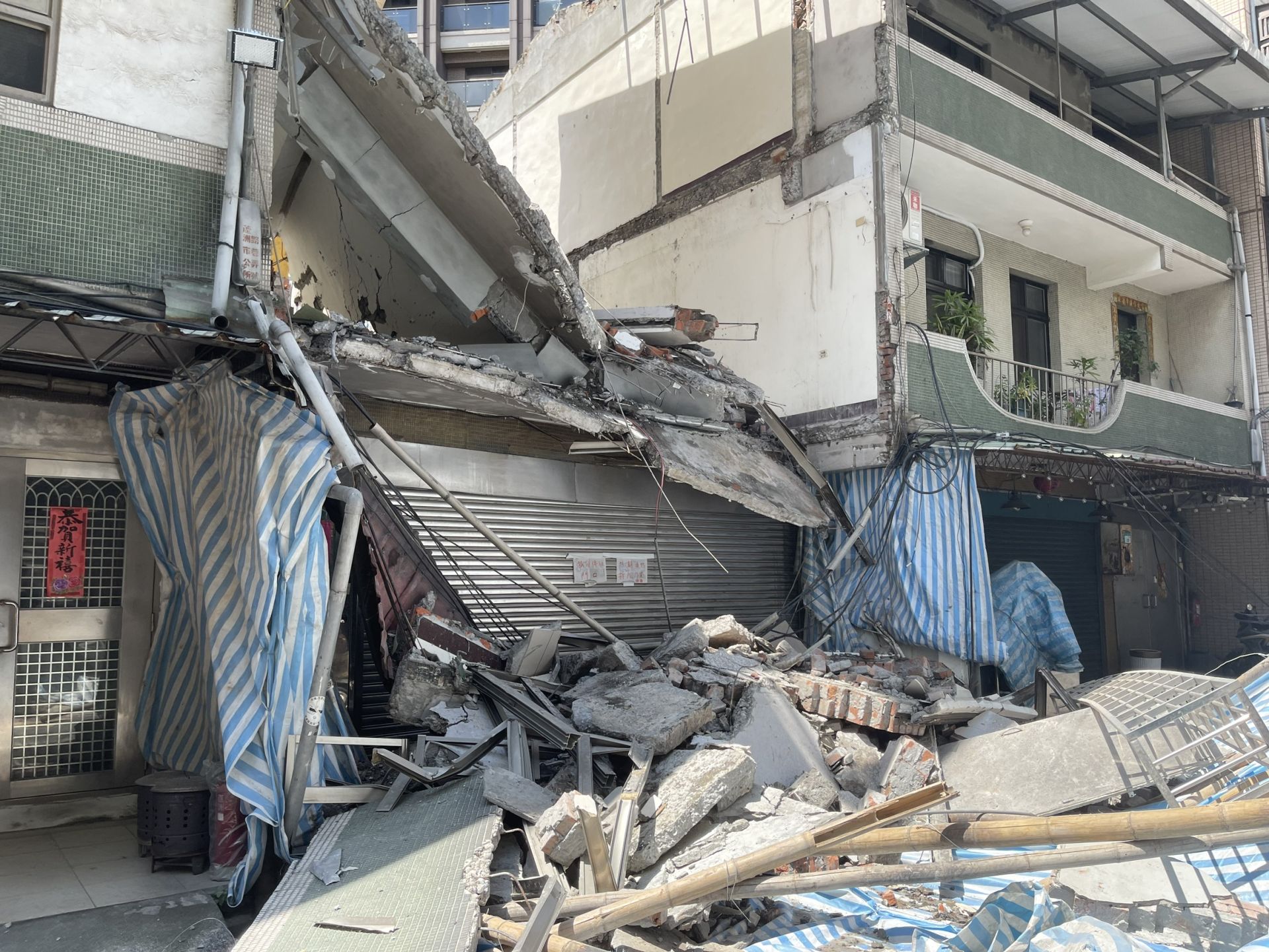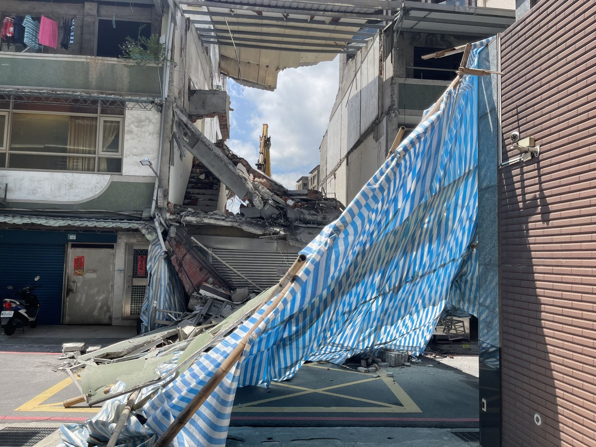 民宅鷹架倒塌波及鄰宅及電纜線。翻攝畫面
