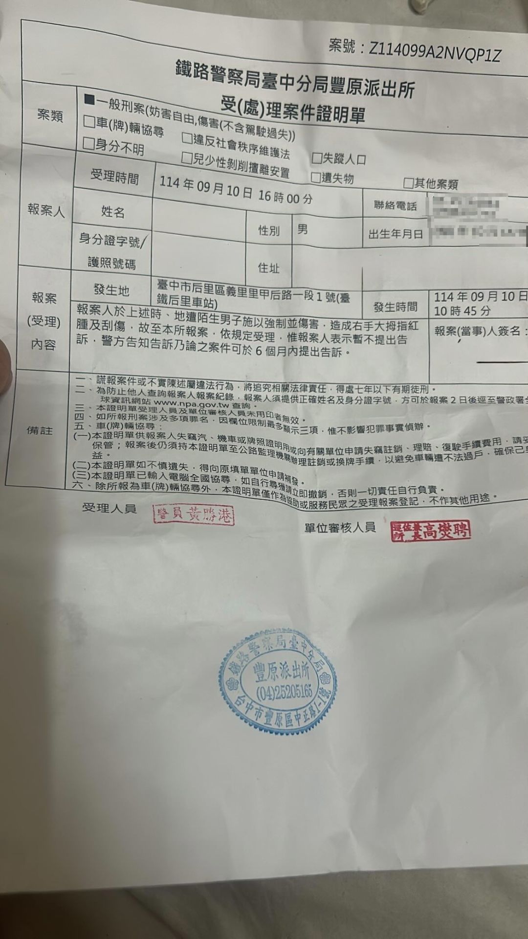 【賴傳媒、記者爆料網/周庭慶/台中報導】台鐵后里站前(10)日發生旅客衝突事件!1名65歲楊姓男子進站時為了老人福利點數無法扣除車資與站務人員發生爭執,一名旁觀旅客以手機錄影並對楊男表示「你這樣是奧客」,楊男繼續解釋引起該乘客不滿並回應「你這樣很吵」、「搞得我頭很痛」,引起楊男不悅動手拍打該乘客,該乘客隨即提告,鐵路警察將全案依強制及傷害罪嫌移送法辦。