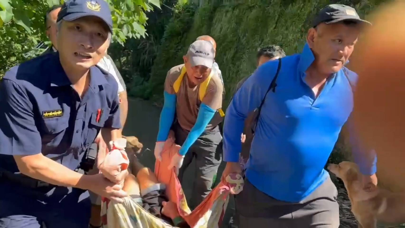 員警及民眾口力將失蹤3天的精障男抬下山。翻攝畫面