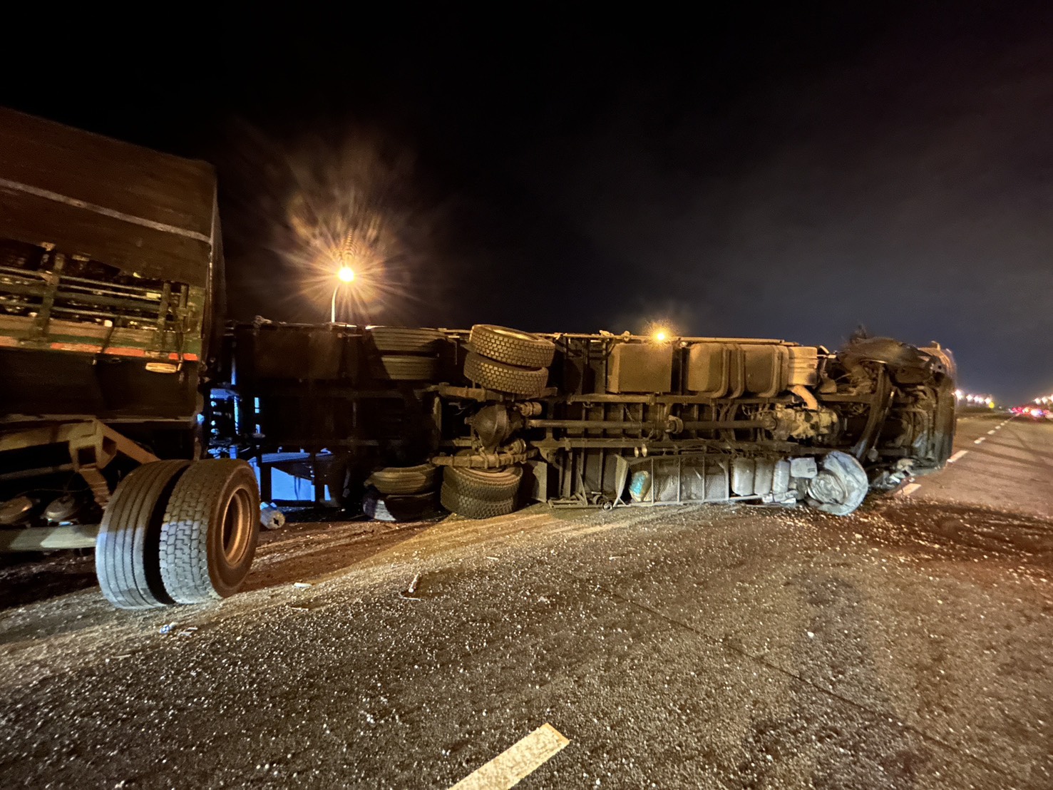 【賴傳媒、記者爆料網/周庭慶/苗栗報導】國道3號北向122.5公里處苗栗縣造橋路段昨(15)日晚間發生翻車事故!晚間22時04分,32歲廖姓男子駕駛載菜的全聯結車行經該路段,因右前車輪爆胎,致車輛撞擊內側護欄側翻於內、中及外側車道,裝菜的散落車道一度造成雙向車阻塞。