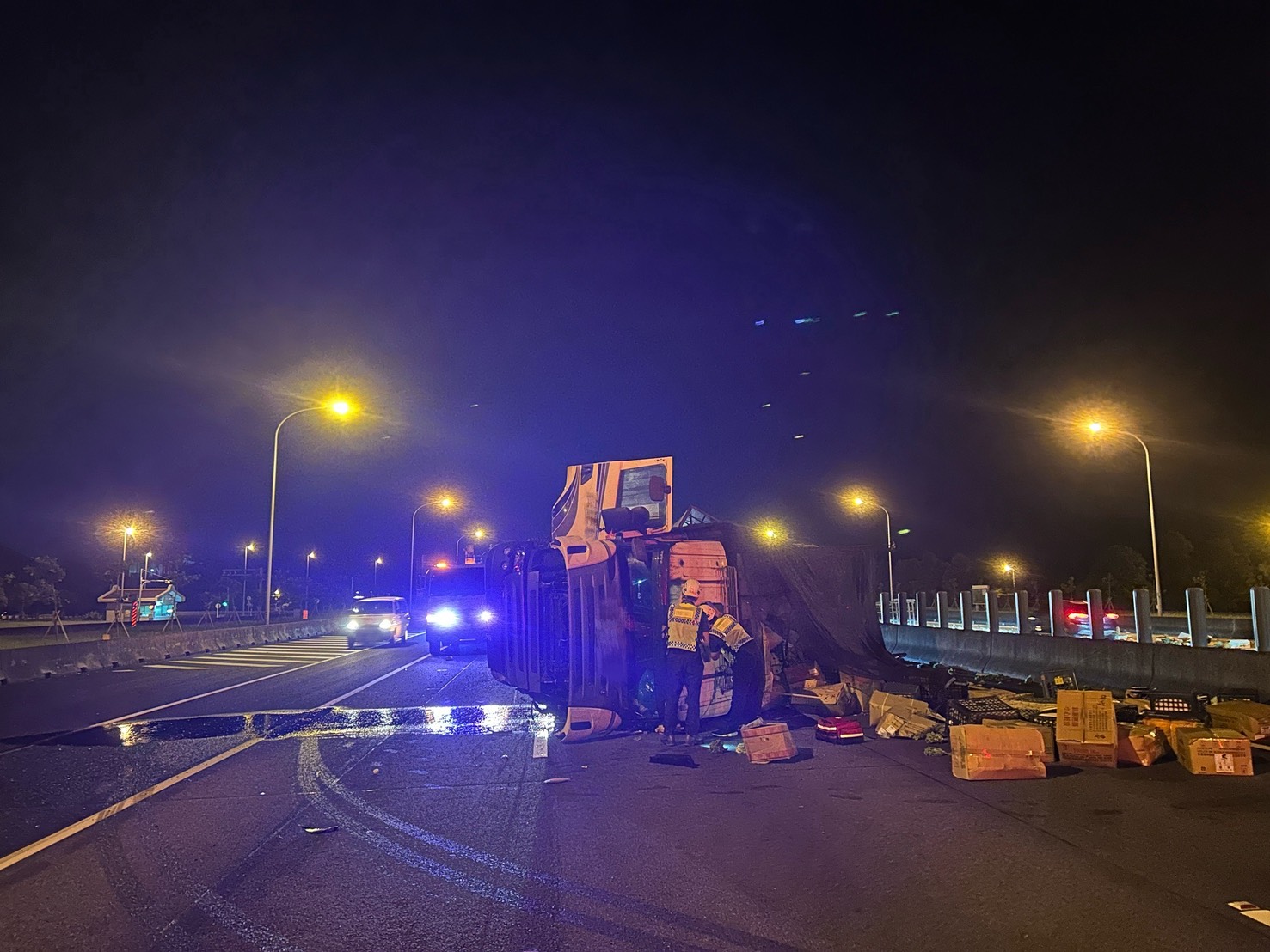 【賴傳媒、記者爆料網/周庭慶/苗栗報導】國道3號北向122.5公里處苗栗縣造橋路段昨(15)日晚間發生翻車事故!晚間22時04分,32歲廖姓男子駕駛載菜的全聯結車行經該路段,因右前車輪爆胎,致車輛撞擊內側護欄側翻於內、中及外側車道,裝菜的散落車道一度造成雙向車阻塞。
