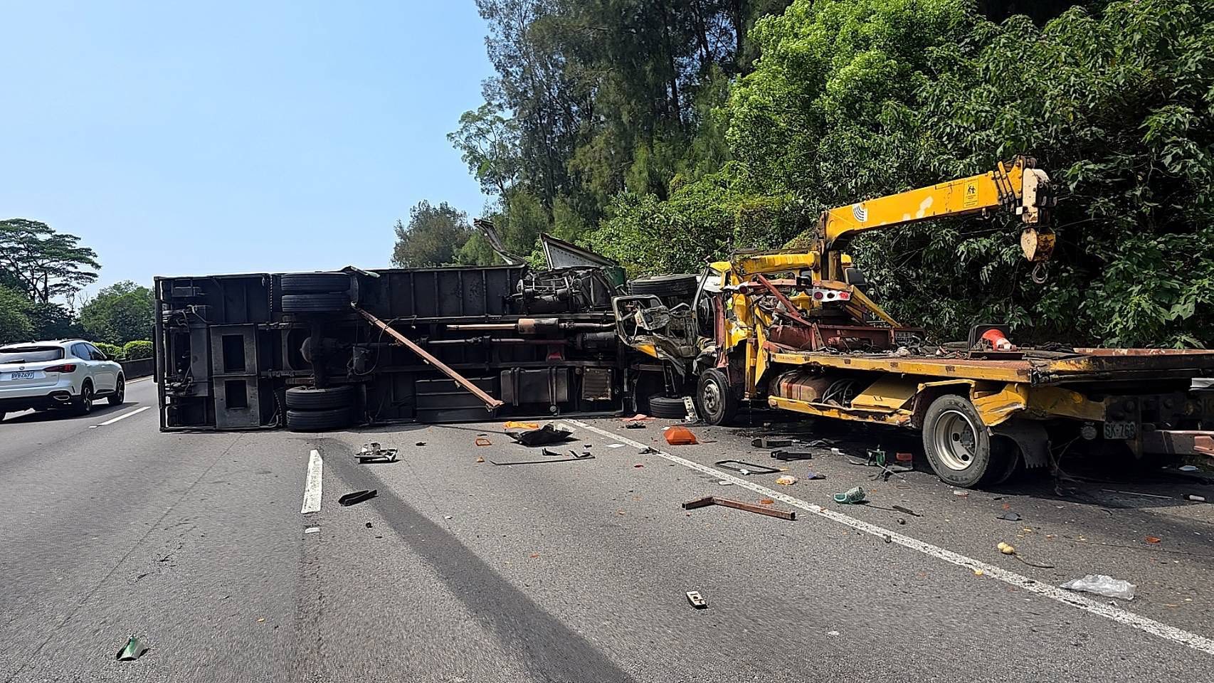 國道3號南下茄冬路段車禍大貨車翻覆。翻攝畫面