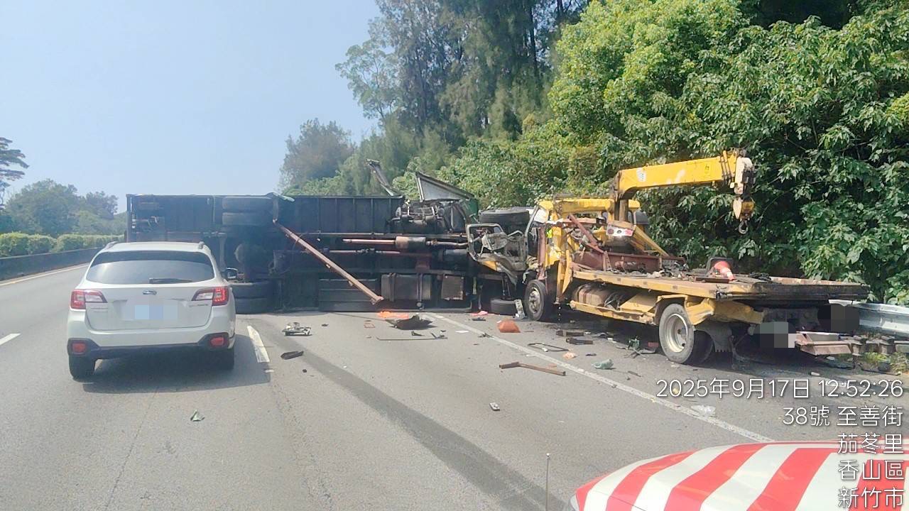 【賴傳媒、記者爆料網/周庭慶/新竹報導】國道3號南向新竹茄苳路段今(17)日發生死亡車禍!12時48分國道警察第六大隊勤指中心接獲通報,國道3號南向105.4公里發生拖吊車遭大貨車擦撞,大真車翻覆、拖吊車司機被撞飛路邊當場OHCA的事故,警方連絡新竹新消防局出動救護車到場,將拖吊車駕駛送醫急救,於13時53分經醫院宣告死亡,肇事原因警方調查釐清中。