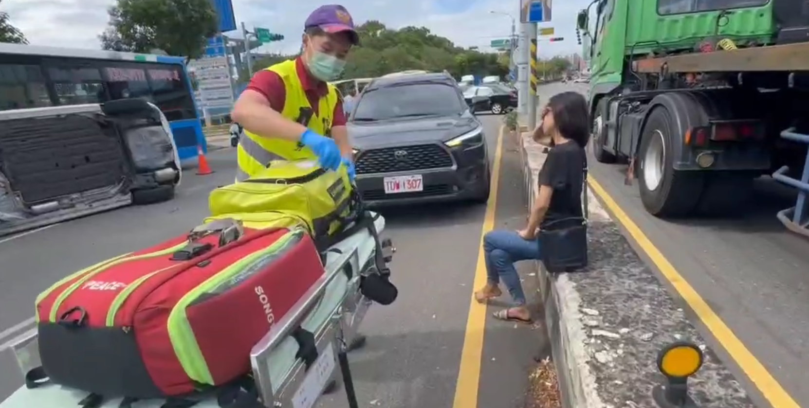 肇事女子坐在分隔島上等候消防隊員檢傷。翻攝畫面