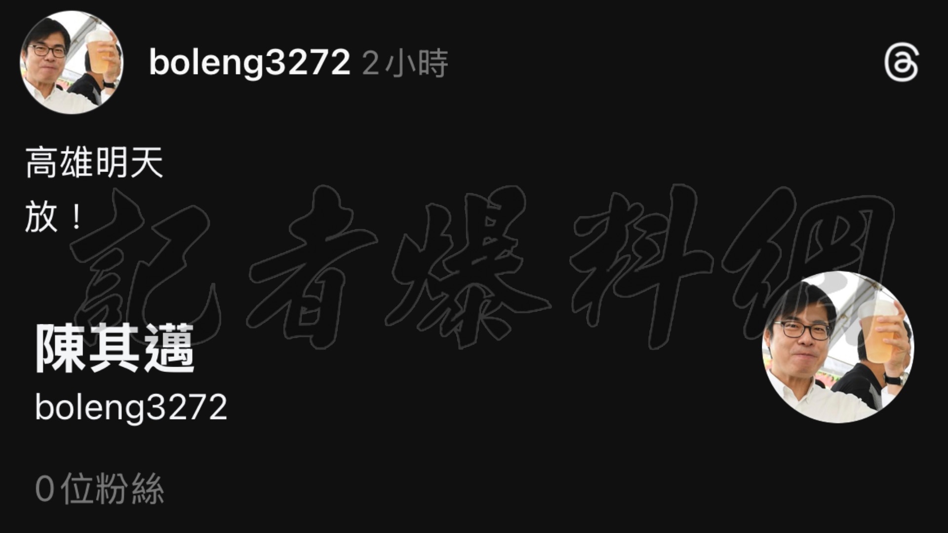 高雄市長陳其邁昨(23)日晚間傳出遭人冒用社群帳號,一名 Threads 帳號名稱為「陳其邁」,並使用其大頭照,在晚間7時左右發文寫道「高雄明天 放」,引起網友注意,不過該貼文在晚間9時左右不明原因下架。