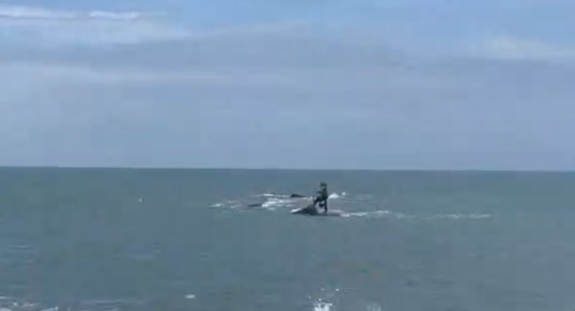 受困男子抱著遙控救生圈游回岸邊。翻攝畫面