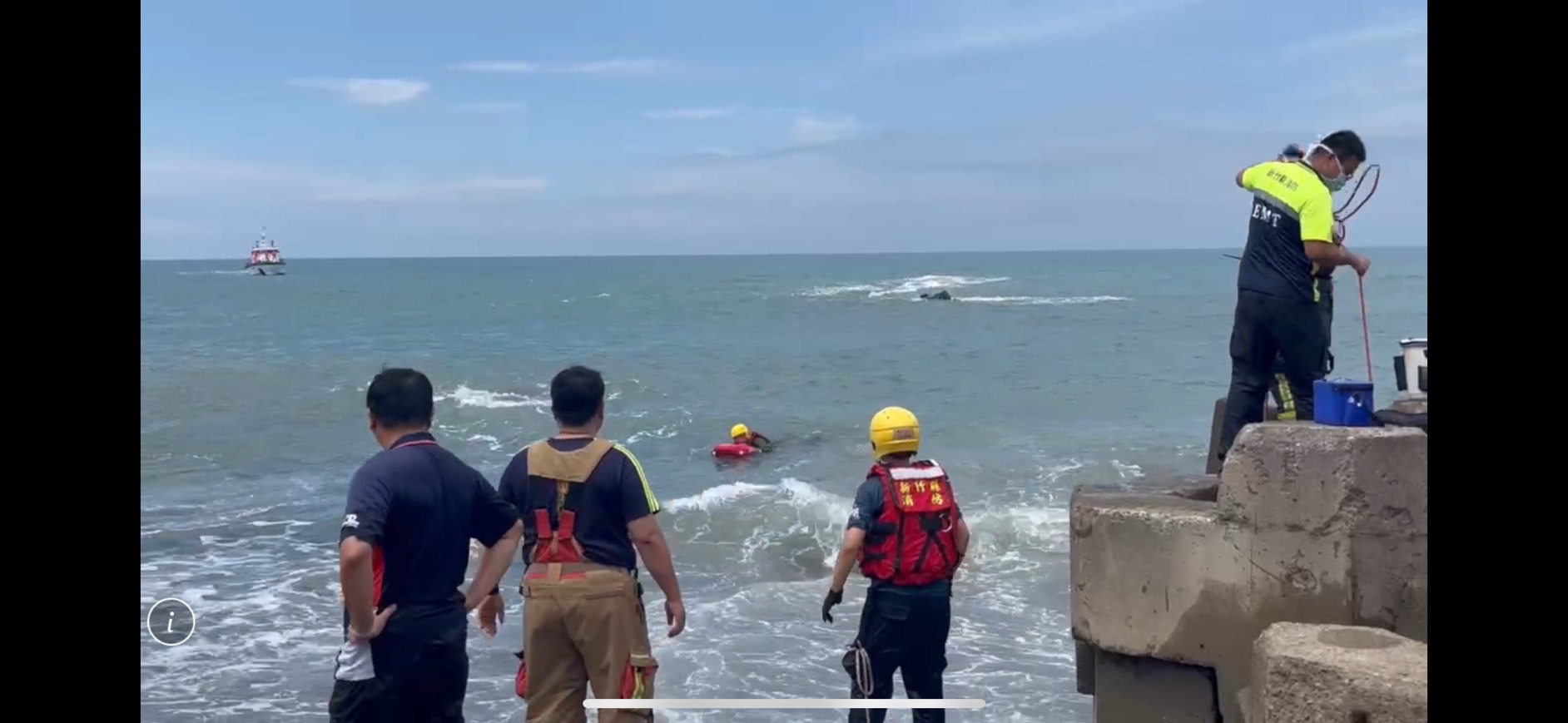 男子受困新竹縣新之沙灘礁石,新竹縣消防局使用遙控救生圈成功救援上岸。翻攝畫面