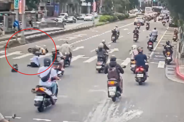 【賴傳媒、記者爆料網 謝建成/台北報導】台北市中山區19日上午8時10分發生一起驚險自摔車禍,地點位於車流繁忙的民權東路三段與龍江路口。一名陳姓女子騎乘普通重型機車由西往東行駛,疑因急於變換車道,與前方車輛距離過近,情急之下緊急煞車,卻因重心不穩當場失控,連人帶車滑倒路面,包包與物品四散飛出,畫面相當驚險。