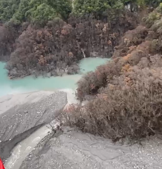 堰塞湖蓄水流出。翻攝畫面