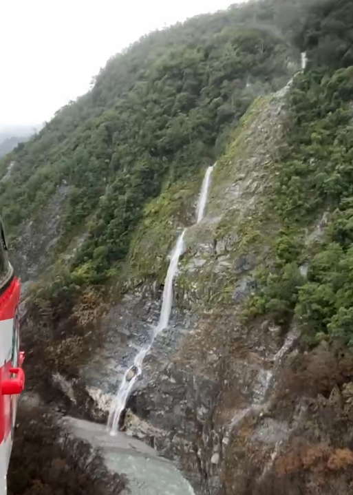 水流如瀑布宣洩而下注入堰塞湖。翻攝畫面