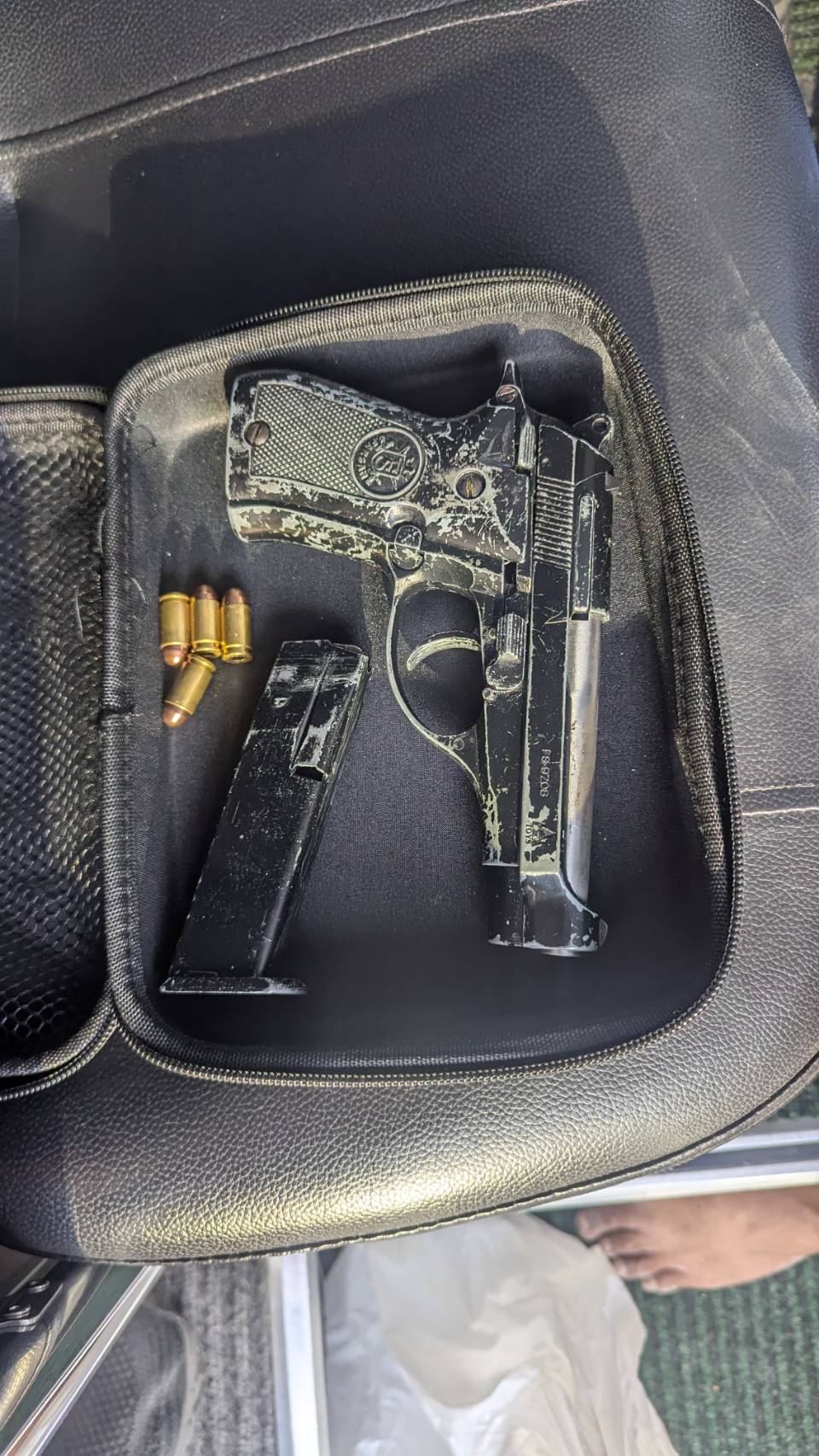 警方在遊覽車駕駛座下搜出的改造手槍及子彈。翻攝畫面