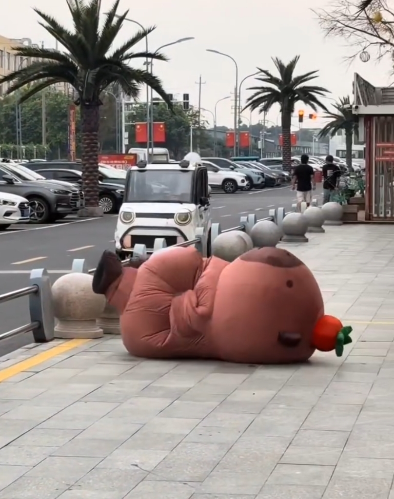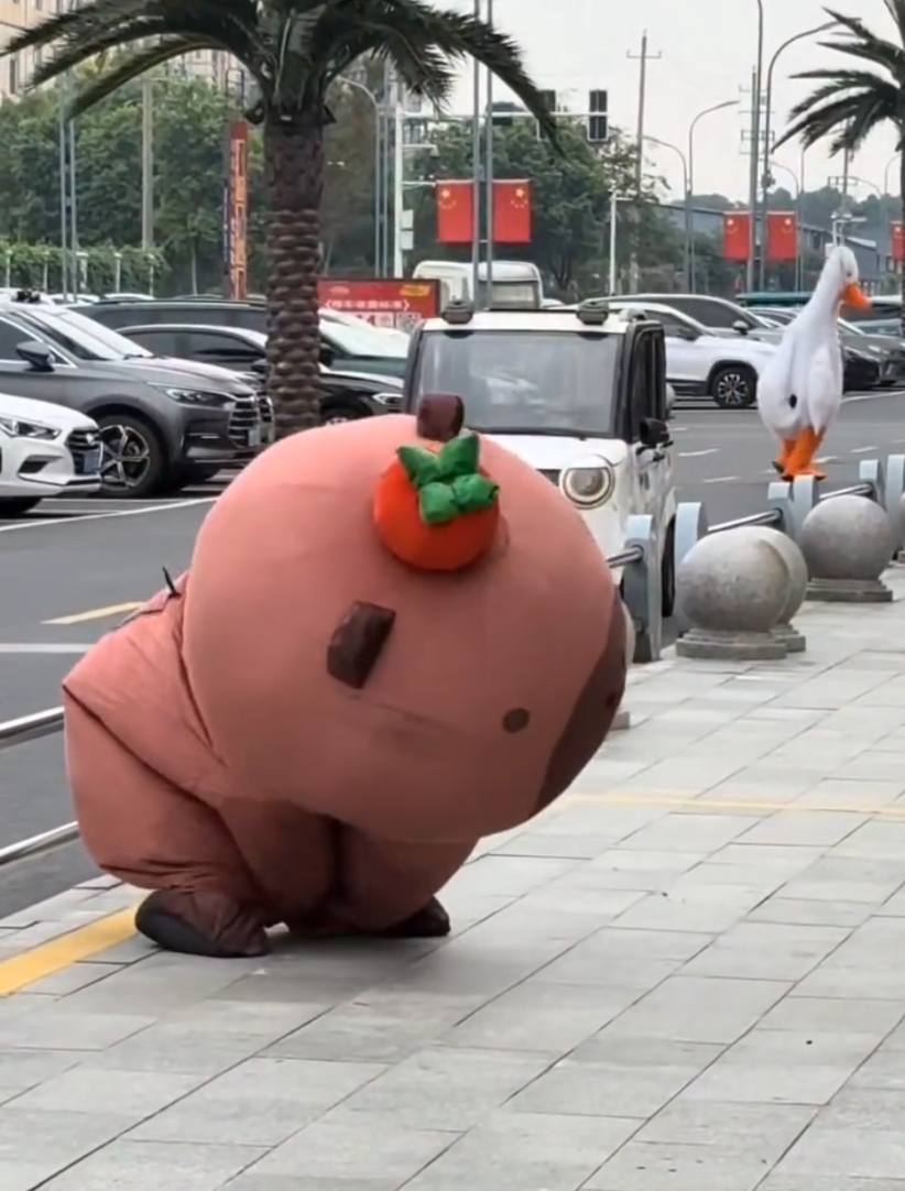 【Lai傳媒、記者爆料網/林千允/綜合報導】Threads上一段66萬次觀看的影片笑翻全網!影片中兩隻可愛的人偶——一隻鴨鴨、一隻卡皮巴拉,原本在活動現場互動,不知何故鴨鴨突然「英勇越欄」跑出去。卡皮巴拉人偶見狀立刻跟上,也奮力一跳跨越欄杆,沒想到下一秒悲劇發生——疑似扮演卡皮巴拉的男子角度沒抓好,直接「蛋撞欄」痛到倒地。