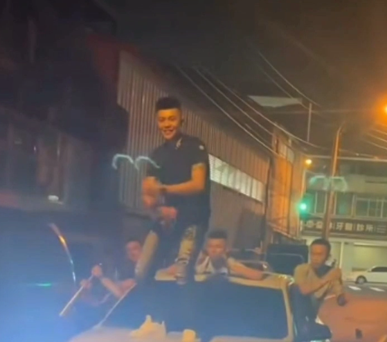 男子站在行進車子引擎蓋上擺動身驅還錄影PO網。翻攝畫面